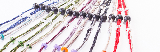 山梨県内で活躍のマクラメ作家 ・ガラス作家 により創りだされたコラボブレスレット。富士山の溶岩を宝石用に加工し、天然石と組み合わせワックスコード糸で一本ずつ編みあげてあります。